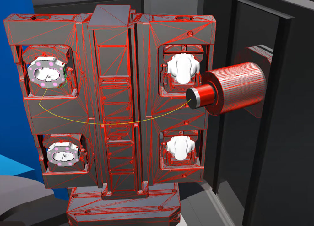 - Realistische 3D Simulation der gesamten Maschine: Von 3-Achs-Fräsmaschinen bis zu 5-Achs-Zentren und komplexen Dreh-Fräszentren mit mehreren Kanälen – Eureka simuliert beliebige Maschinenkinematiken detailgetreu. Alle Komponenten (Spindeln, Rundtische, Revolver, etc.) werden in die 3D Maschinensimulation einbezogen.